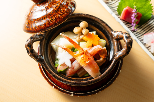 富士の伏流水で丁寧にとったこだわりの出汁を使い、ズワイガニの旨みを引き立てた小鍋をお楽しみいただける、期間限定の特別会席コース付プランです。