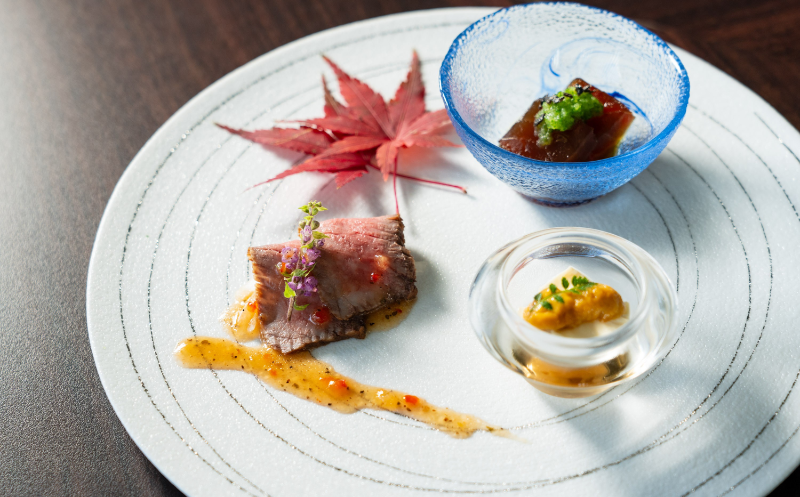和牛ローストビーフの旨み、メバチマグロの漬けの深い味わいが、先付から心を満たします。
